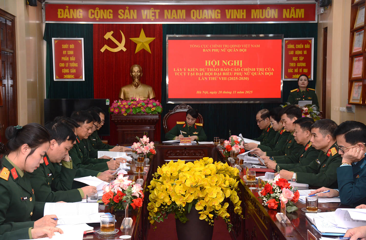 Chiều 28-11, tại Hà Nội, Ban Phụ nữ Quân đội (Tổng cục Chính trị Quân đội nhân dân Việt Nam) tổ chức Hội nghị lấy ý kiến vào dự thảo Báo cáo chính trị của Tổng cục Chính trị trình Đại hội đại biểu phụ nữ Quân đội lần thứ VIII và Chương trình hành động của phụ nữ Quân đội 5 năm (2025 - 2030). Đại tá Nguyễn Thị Thu Hiền - Trưởng ban Phụ nữ Quân đội chủ trì hội nghị.