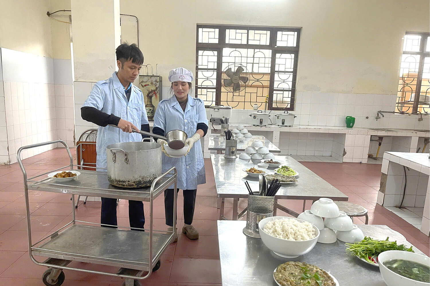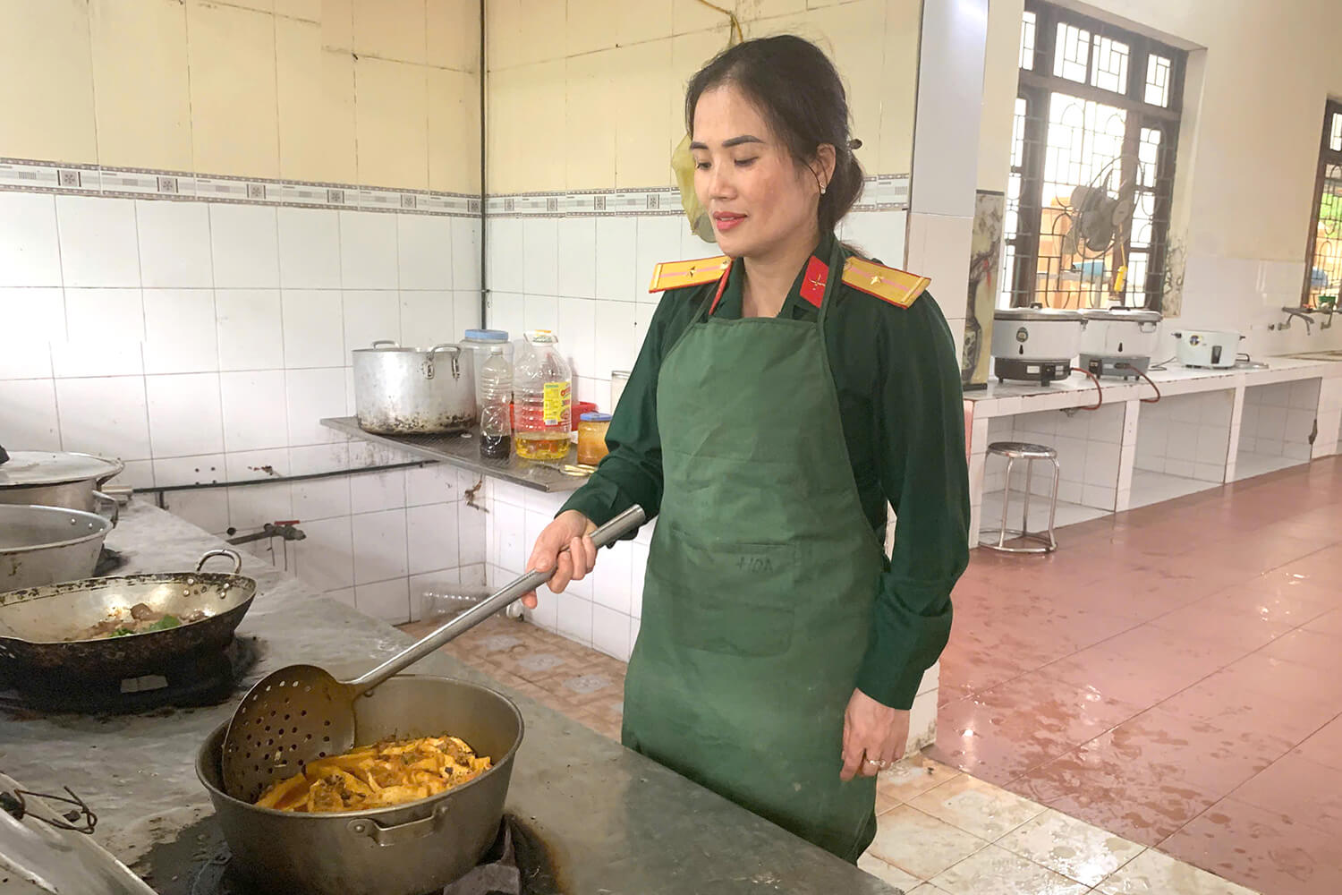 Chị Diệu cùng đồng đội chuẩn bị bữa ăn cho cán bộ, chiến sĩ