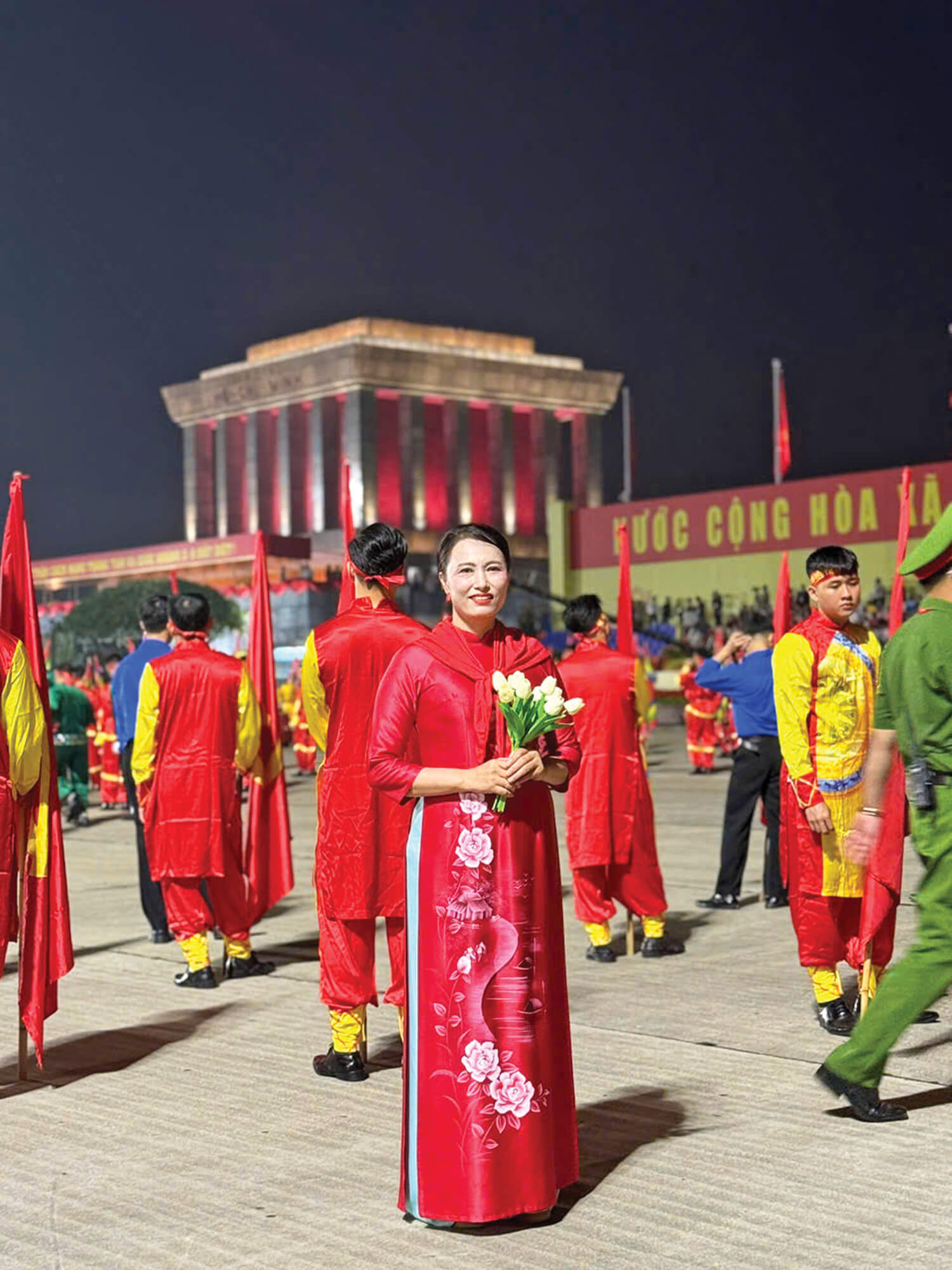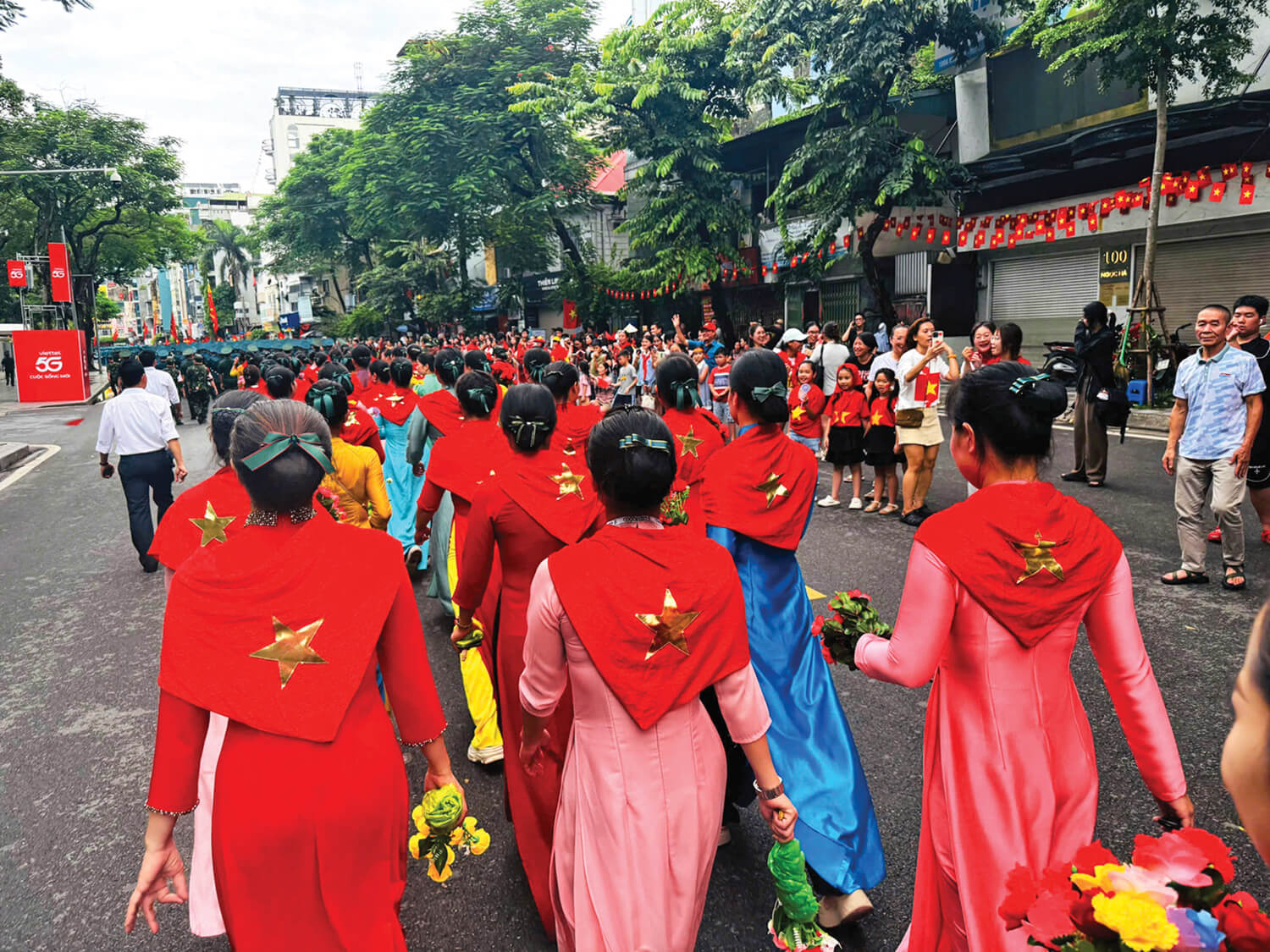 Hành quân hơn 5km và đứng trong nhiều giờ đồng hồ, nên mỗi bộ trang phục, mỗi đôi giày đều được lựa chọn kỹ càng: vừa vặn, đủ cao, đủ êm chân. Các chị em đều trang điểm nhẹ, tóc búi gọn, khoác tà áo dài đỏ thắm, tay cầm bó hoa tươi, vai đeo lá cờ đỏ sao vàng, tạo nên một khối đồng đều, nổi bật, duyên dáng và đầy khí chất. Nhìn từ xa, đội hình vẫy hoa như một dải lụa sống động, mềm mại, trang nghiêm, mang tinh thần dân tộc.