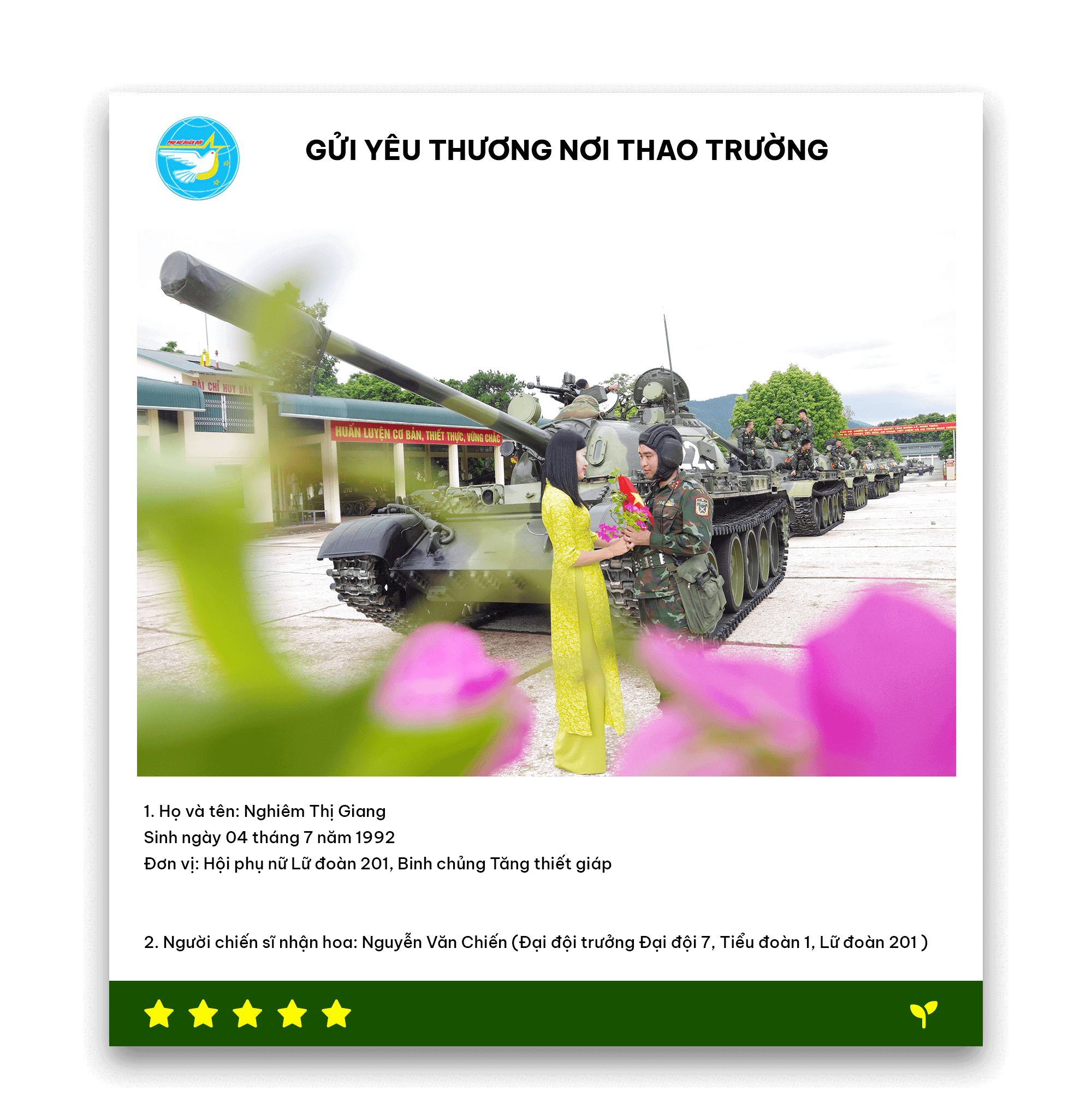 Trong khoảnh khắc dung dị nhưng chan chứa tình cảm, người vợ trong tà áo dài vàng tươi thắm trao tặng bó hoa cho chồng – người chiến sĩ Tăng thiết giáp đang làm nhiệm vụ. Giữa không gian thao trường, hình ảnh ấy trở thành biểu tượng của tình yêu và niềm tin: hậu phương ấm áp luôn đồng hành, tiếp thêm sức mạnh để người lính vững vàng nơi tuyến đầu.