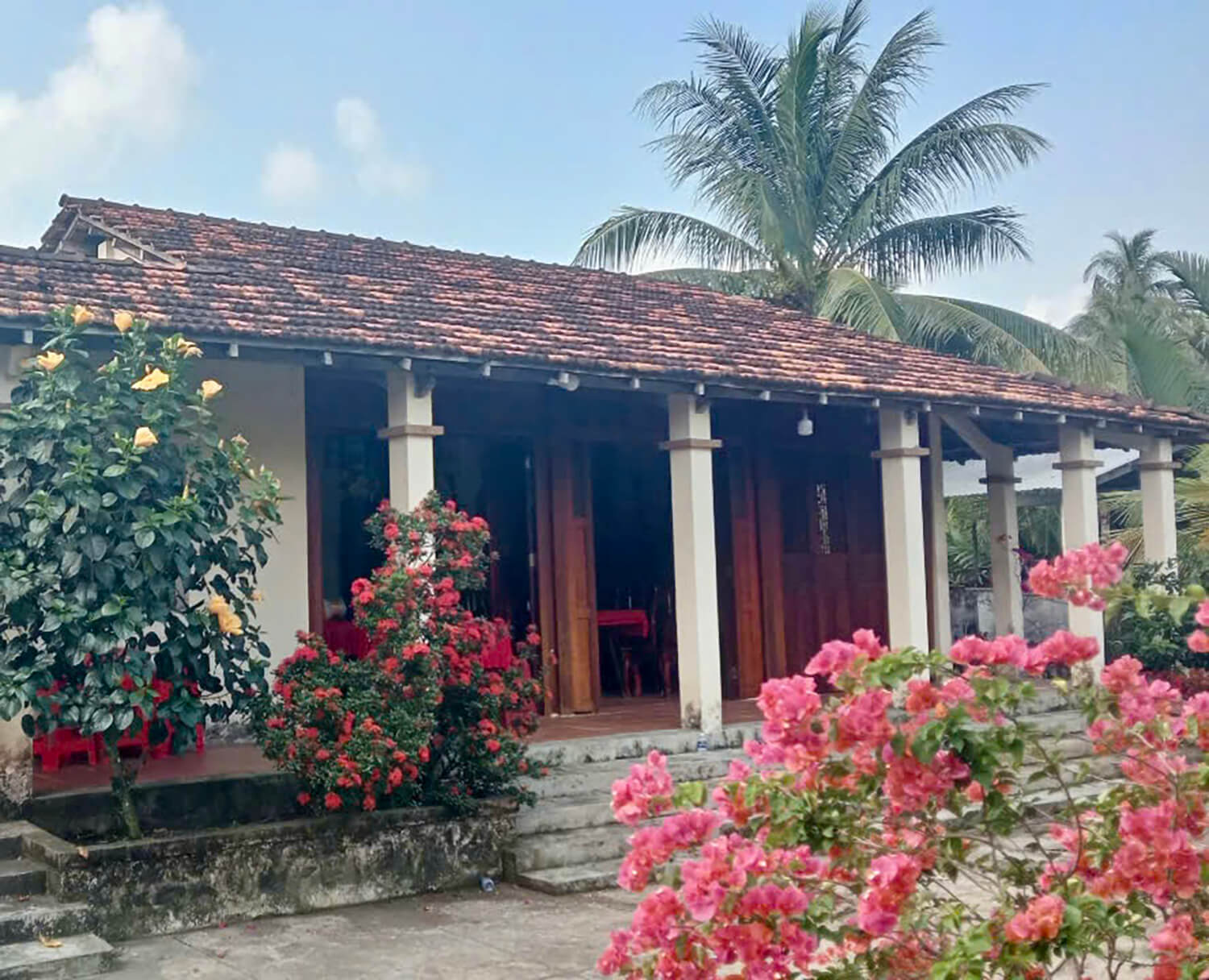 Từ khu lưu niệm Nguyễn Thị Định tọa lạc ở trung tâm xã Lương Hòa, về thăm ngôi nhà lưu dấu tuổi thơ và thời thanh niên sôi nổi của vị Nữ tướng, lòng tôi bổi hổi bồi hồi. Con đường bê tông lắt lẻo men theo dòng sông nhỏ ngầu đục phù sa, hai bên bờ ken dày những bụi dừa nước ong óng xanh. Nắng xiên kẽ lá rắc rây vàng ruộm. Cây trái sum suê nhoài ra tận đầu ngõ, níu bước chân người. Căn nhà nhỏ hiện ra thật đơn sơ, cột gỗ vuông, mái lợp ngói tây. Khoảnh sân nhỏ, rợp các loài hoa, từ hoa bông trang (mẫu đơn), hoa giấy, đến hoa pháo bông, xúm xít sắc màu.