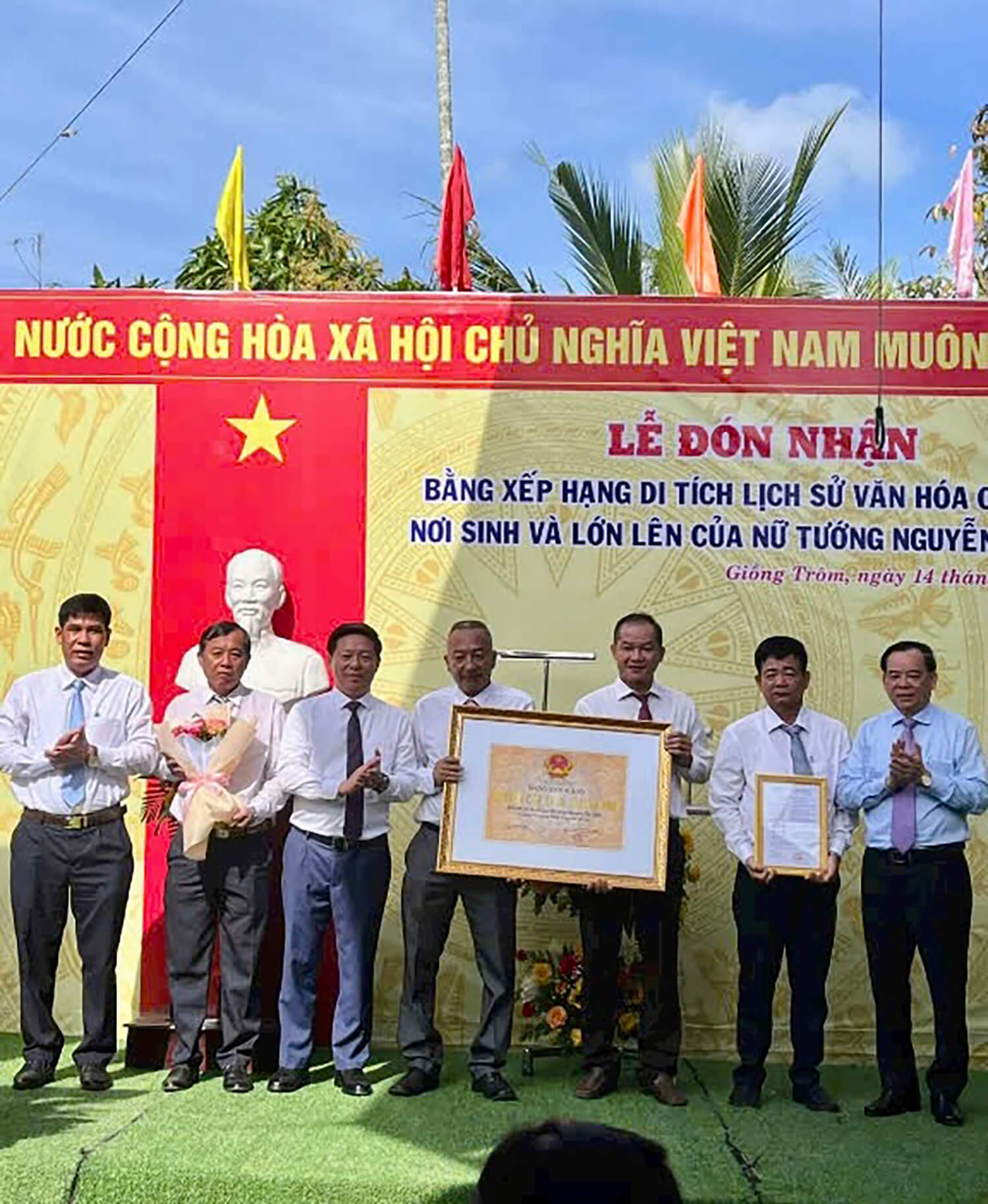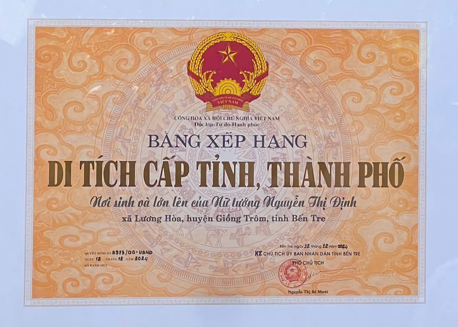 Huyện ủy, Hội đồng Nhân dân, UBND, Ủy ban Mặt trận Tổ quốc Việt Nam huyện Giồng Trôm đã phối hợp xã Lương Hòa và gia đình cô Ba Định tổ chức Lễ đón nhận bằng xếp hạng Di tích lịch sử - văn hóa. Lãnh đạo Tỉnh ủy, UBND tỉnh, các cơ quan ban ngành của tỉnh Bến Tre, huyện Giồng Trôm cùng các đại biểu đã về dự và chia vui. Buổi lễ diễn ra đúng vào dịp kỷ niệm 105 năm ngày sinh Anh hùng LLVTND, Nữ tướng Nguyễn Thị Định (15-3-1920 - 15-3-2025). Đây là một hoạt động hết sức có ý nghĩa, thể hiện tình cảm và sự tri ân sâu sắc của thế hệ đương thời, trong đó có Đảng bộ, chính quyền và nhân dân Bến Tre nói chung, huyện Giồng Trôm nói riêng đối với Nữ tướng, anh hùng Nguyễn Thị Định.