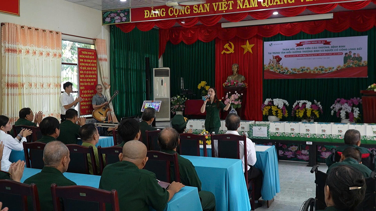 Lãnh đạo Bệnh viện trao nhiều phần quà tặng Trung tâm Điều dưỡng Thương binh và người có công Long Đất và các thương binh, bệnh binh đang điều trị tại đây. Các thành viên đoàn công tác còn biểu diễn văn nghệ, động viên tinh thần các thương binh, bệnh binh.