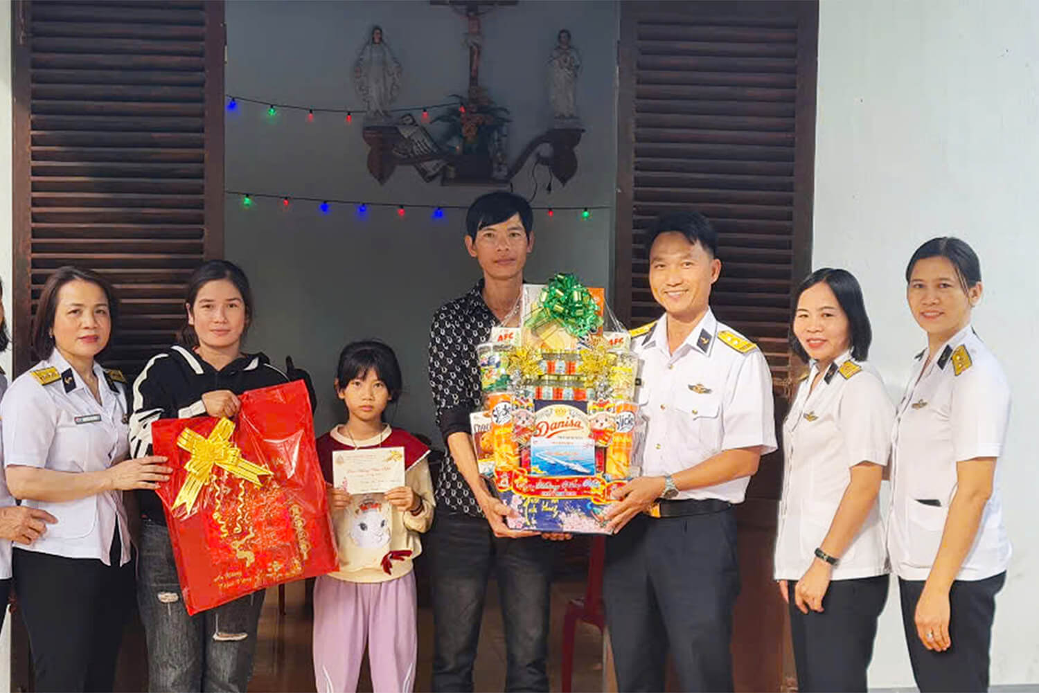Trước Tết Nguyên đán Ất Tỵ, đoàn công tác Lữ đoàn 162 (Vùng 4 Hải quân) đến thăm, tặng quà Tết cho 2 cháu được nhận đỡ đầu ở xã Cam Hòa, huyện Cam Lâm, tỉnh Khánh Hòa.