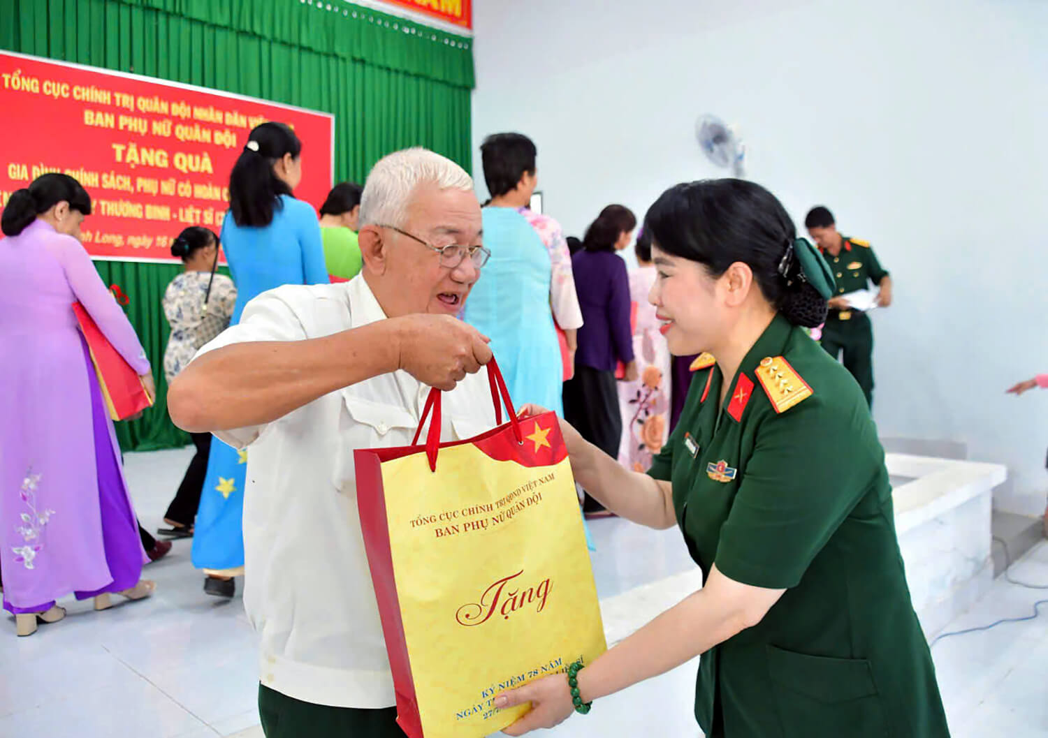 Về xã Long Hưng (tỉnh Đồng Tháp), tại buổi gặp mặt, nhận quà tri ân của Ban PNQĐ, ông Trần Văn Bạch, một cựu chiến binh tóc bạc trắng xúc động nói: “Mỗi dịp lễ, Tết, các cháu lại đến thăm. Quân khu, địa phương, các tổ chức đoàn thể luôn nhớ đến chúng tôi, khiến tuổi già thêm ấm lòng. Năm nay được các cháu phụ nữ quân đội đến thăm, tôi càng xúc động hơn...”, ánh mắt người lính già lấp lánh niềm vui. Không chỉ mang theo những món quà nghĩa tình, các chị còn mang đến sự ấm áp, sẻ chia và lòng biết ơn sâu sắc của thế hệ hôm nay đối với những người đã hy sinh cả tuổi xuân cho Tổ quốc. Với ông, đó không chỉ là một cuộc gặp gỡ, mà là nguồn động viên tinh thần lớn lao, để những người lính năm xưa thấy lòng mình vẫn được sưởi ấm bởi tình quân dân bền chặt, bởi truyền thống không bao giờ lãng quên.