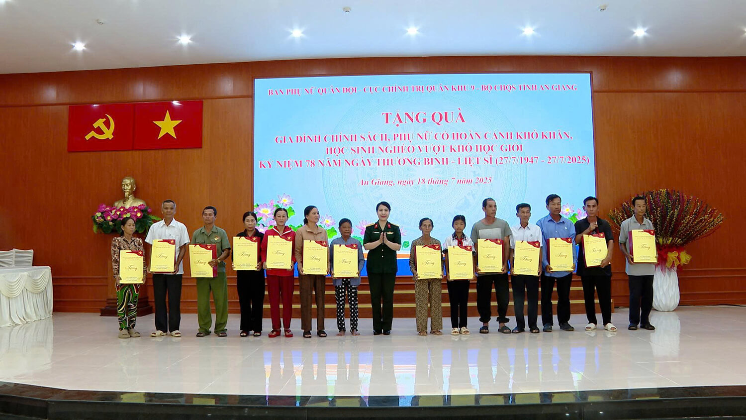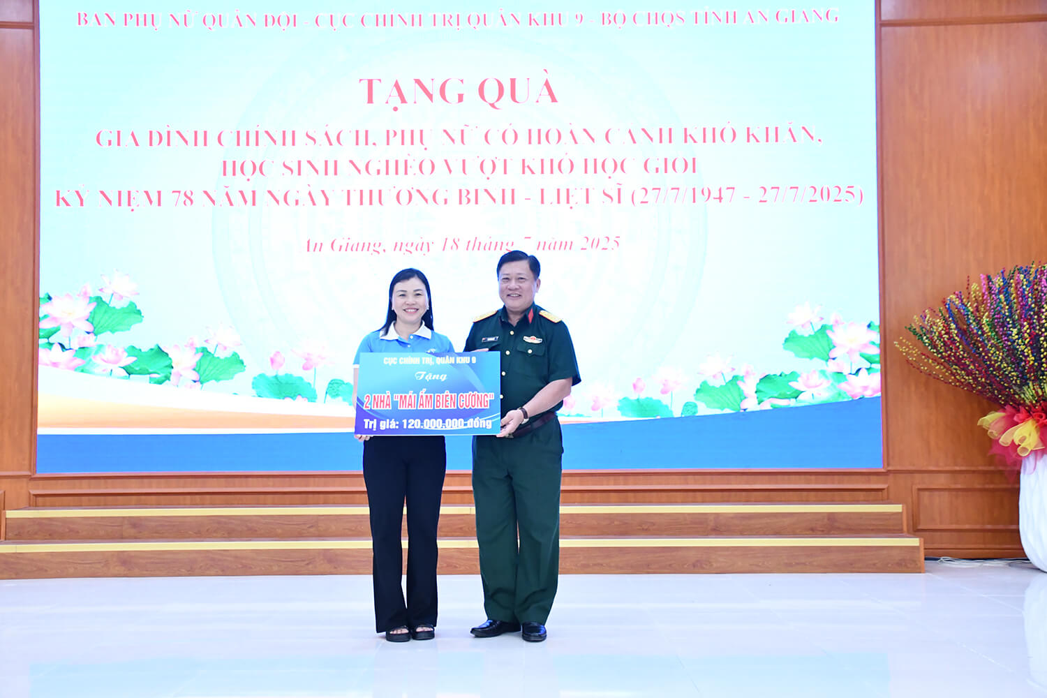 Cùng với nghĩa cử cao đẹp ấy, Cục Chính trị Quân khu 9 đã trao tặng 3 căn nhà “Mái ấm biên cương” cho phụ nữ có hoàn cảnh khó khăn tại Đồng Tháp, An Giang; trao 15 suất học bổng cho học sinh nghèo vượt khó, với tổng kinh phí hơn 200 triệu đồng, những món quà thắm đượm nghĩa tình quân dân, tiếp thêm niềm tin và nghị lực cho những hoàn cảnh còn nhiều thiệt thòi trong cuộc sống.