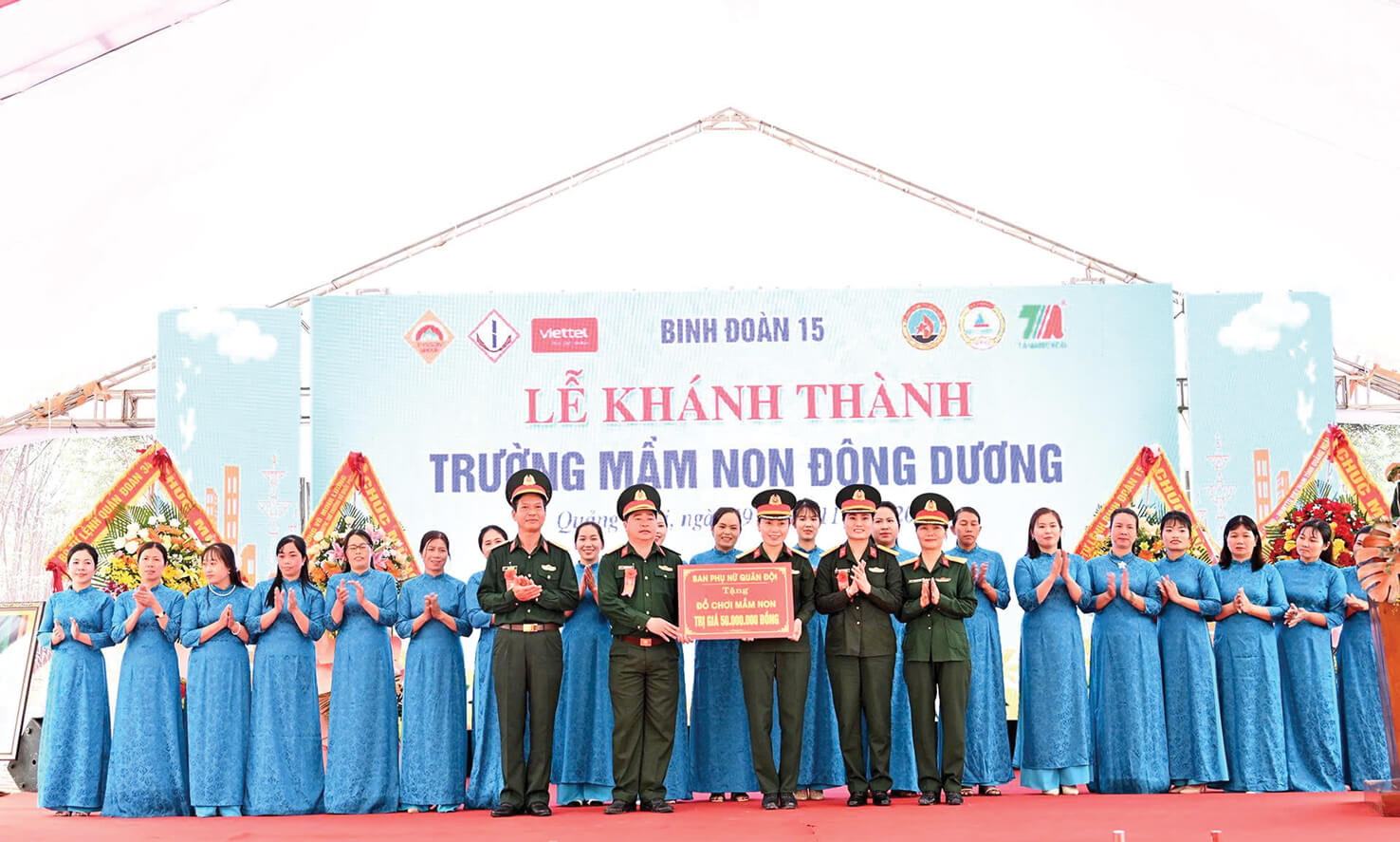 Nhân dịp khánh thành hai trường mầm non mới của Binh đoàn 15: Trường Mầm non Sao Mai, Đoàn Kinh tế - Quốc phòng (KT-QP) 75 (xã Ia Krel, tỉnh Gia Lai) và Trường Mầm non Đông Dương, Đoàn KT-QP 732 (xã Sa Loong, tỉnh Quảng Ngãi), Ban Phụ nữ Quân đội đã trao tặng mỗi trường một bộ đồ chơi ngoài trời trị giá 50 triệu đồng. Đây là phần quà thiết thực, góp phần bổ sung cơ sở vật chất, tạo dựng không gian vui chơi an toàn và khang trang cho trẻ em vùng biên.