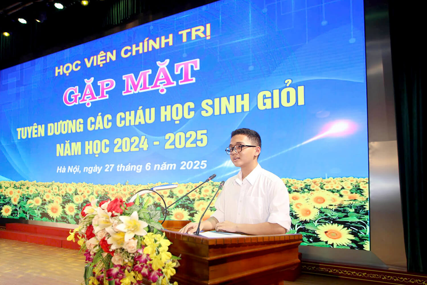 Đại diện cho các học sinh được tuyên dương, cháu Nguyễn Đức Lâm bày tỏ lòng biết ơn đối với các bác lãnh đạo Học viện, hứa tiếp tục nỗ lực phấn đấu học tập, rèn luyện để không phụ lòng tin và sự quan tâm chăm sóc.