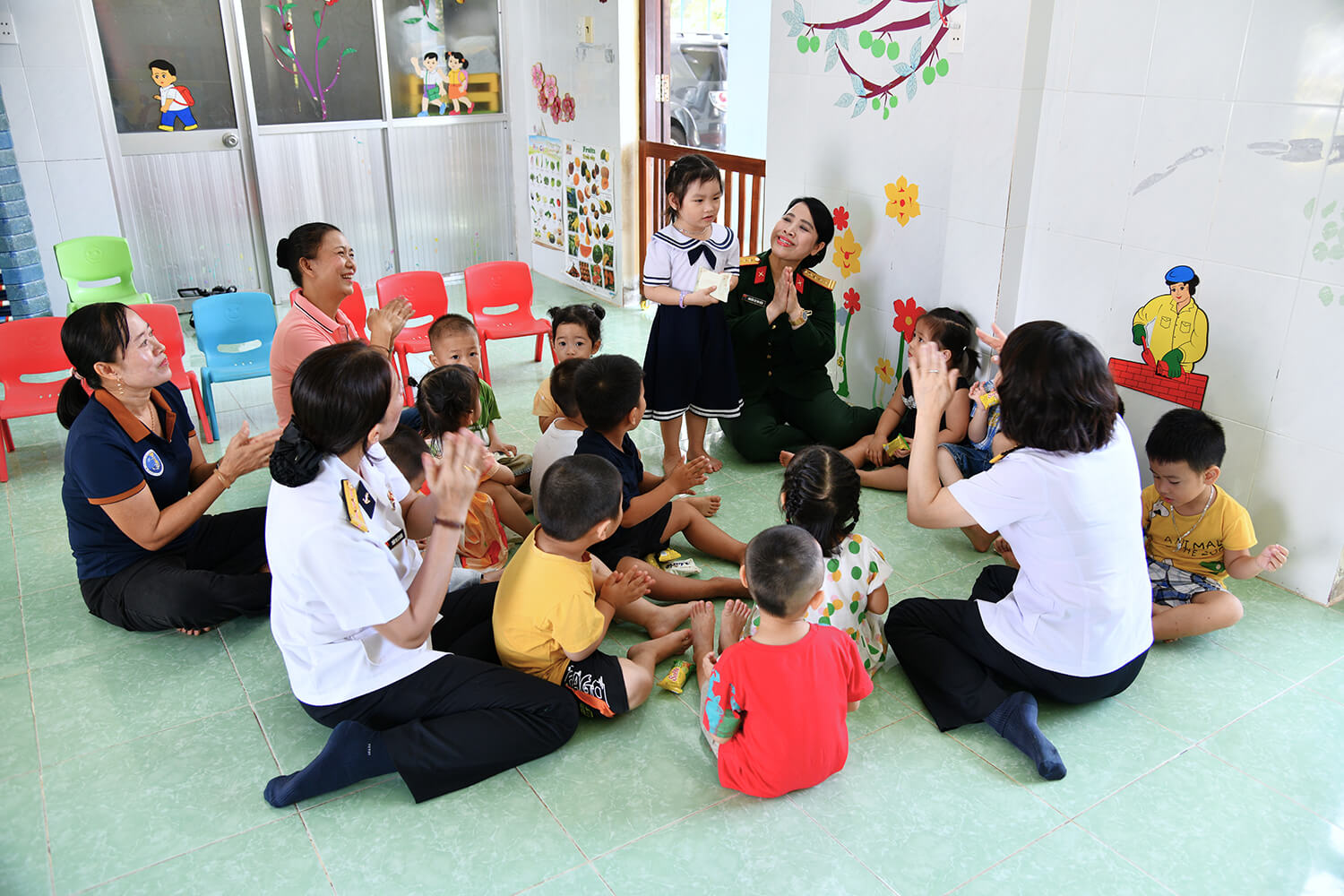 Ở vùng biển phía Tây Nam của Tổ quốc, trong khuôn viên xanh, sạch, thoáng mát, Nhà trẻ Vùng 5 Hải quân được Bộ Quốc phòng đầu tư xây dựng khang trang, rộng rãi. Hàng năm, nhà trẻ đã huy động, đón nhận và tổ chức ăn bán trú cho 100% các cháu là con cán bộ, nhân viên, chiến sĩ Vùng 5; thực đơn của trẻ được thay đổi theo tuần, khẩu phần ăn được tính định lượng cân đối các chất dinh dưỡng, được kiểm thực 3 bước và tuyệt đối đảm bảo vệ sinh an toàn thực phẩm; 100% trẻ được quân y đơn vị khám sức khỏe định kỳ 2 lần/năm. Tại thời điểm kiểm tra, Đoàn kiểm tra đánh giá cao công tác nuôi dưỡng, chăm sóc trẻ tại nhà trường với kết quả 100% trẻ phát triển tốt, không có trẻ bị suy dinh dưỡng thể nhẹ cân hay béo phì. Đội ngũ giáo viên, nhân viên nơi đây luôn gắn bó, tâm huyết với nghề, trách nhiệm, yêu thương con trẻ như chính những đứa con ruột thịt của mình. Vượt qua khó khăn về khoảng cách địa lý, các cô luôn sẵn sàng học tập, tham gia các lớp tập huấn chuyên môn nghiệp vụ, tranh thủ tự nghiên cứu tài liệu, học hỏi kinh nghiệm từ bạn bè đồng nghiệp trong và ngoài Quân đội để có thể cho trẻ được tiếp cận, làm quen với những mô hình và phương pháp giáo dục tiên tiến, không để các con thiệt thòi hơn so với các bạn cùng trang lứa nơi đất liền.