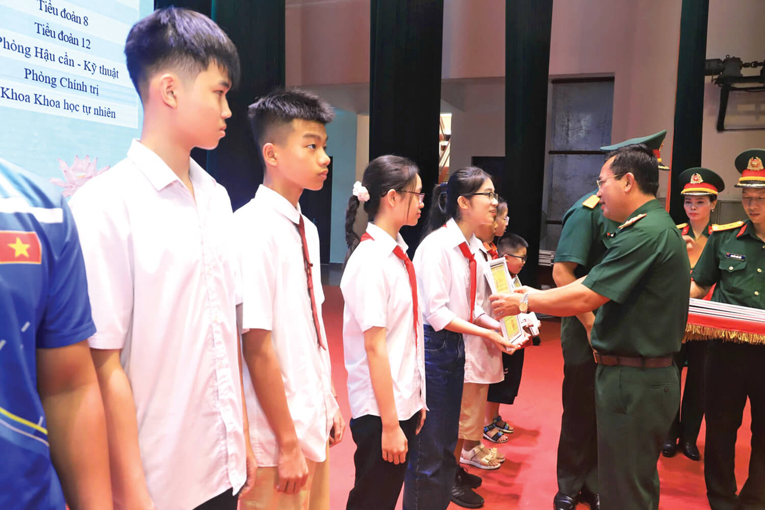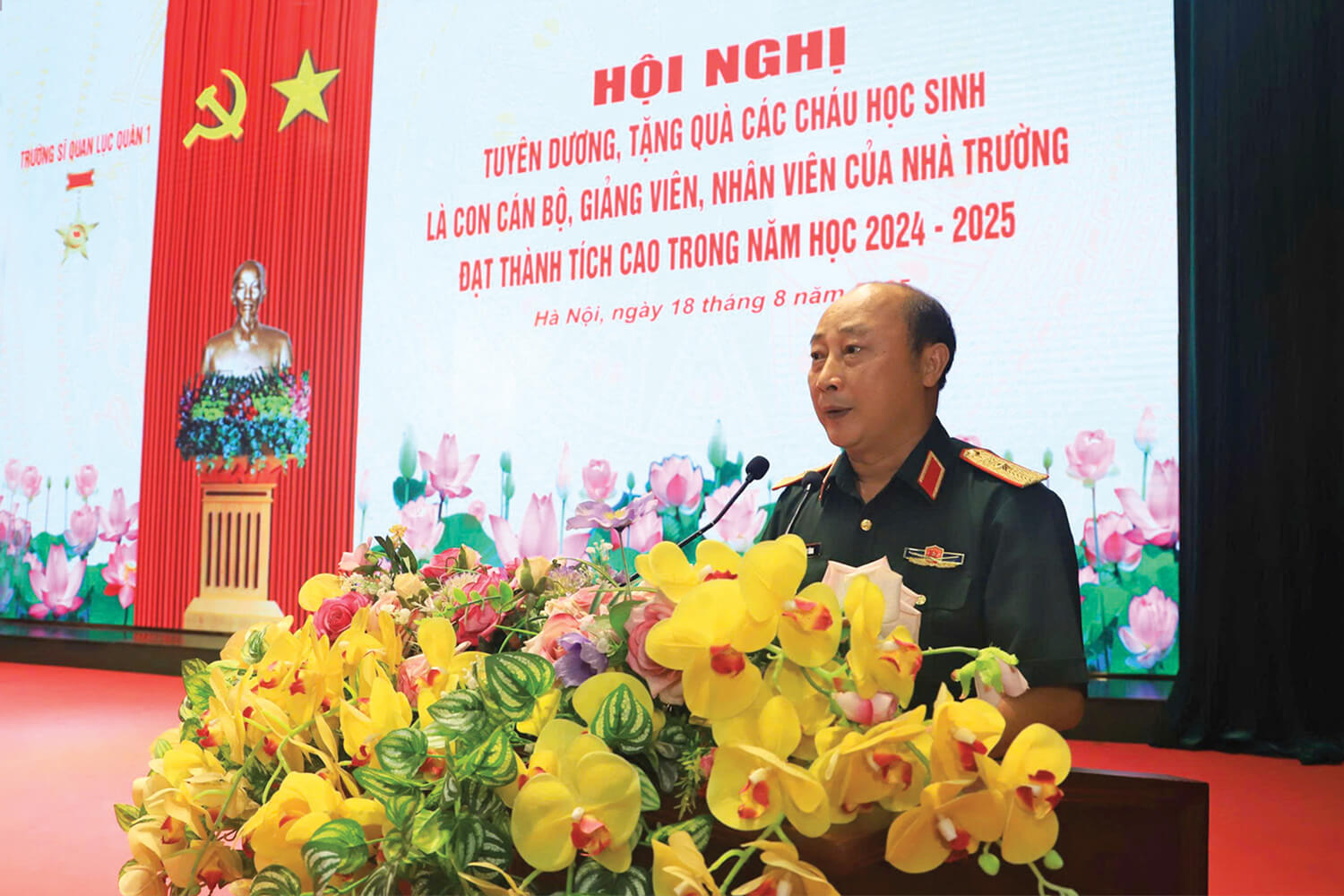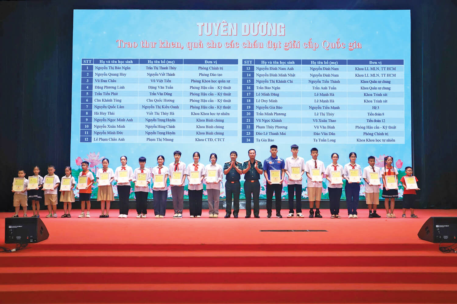 Nhằm ghi nhận và khích lệ tinh thần hiếu học, Trường Sĩ quan Lục quân 1 đã tổ chức Hội nghị tuyên dương, trao quà cho các em học sinh là con cán bộ, giảng viên, nhân viên đạt thành tích xuất sắc trong các kỳ thi học sinh giỏi năm học 2024-2025. Hoạt động ý nghĩa này thể hiện sự quan tâm sâu sắc của Đảng ủy, Ban Giám hiệu cùng Ban Dân số - Gia đình & Trẻ em Nhà trường. Những phần quà không chỉ là lời động viên, khích lệ các em trước thềm năm học mới, mà còn là sự sẻ chia, chăm lo thiết thực với hậu phương quân nhân, giúp cán bộ, giảng viên, nhân viên yên tâm công tác, hoàn thành tốt nhiệm vụ.