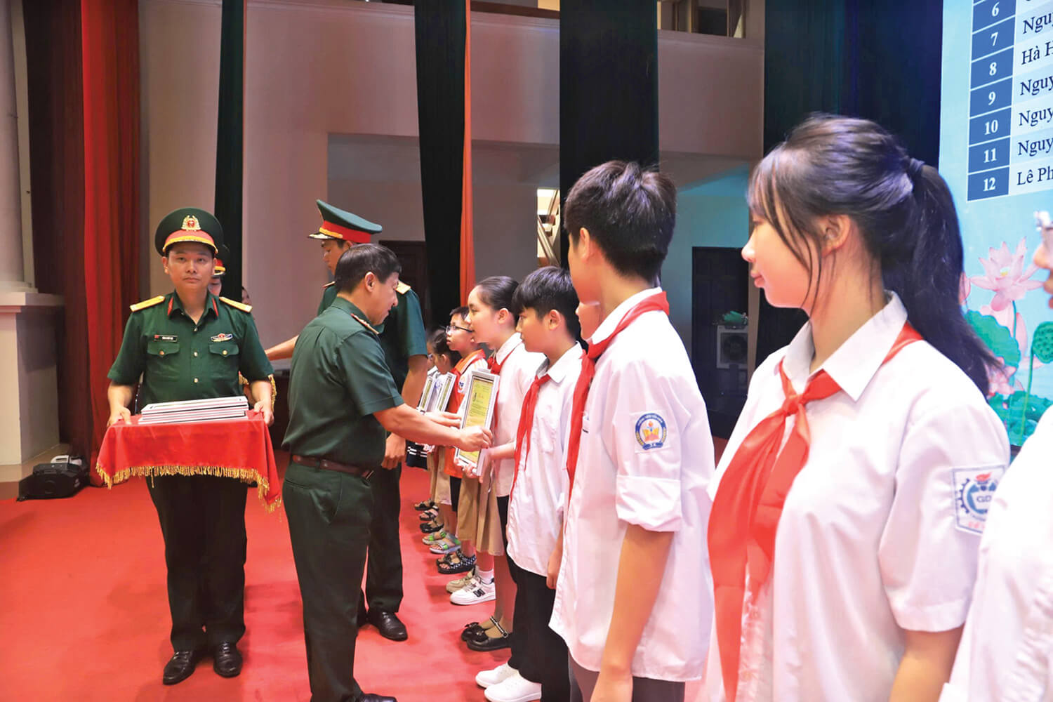 Thiếu tướng Hiệu trưởng Nguyễn Trung Hiếu trao thưởng các cháu đoạt giải quốc gia