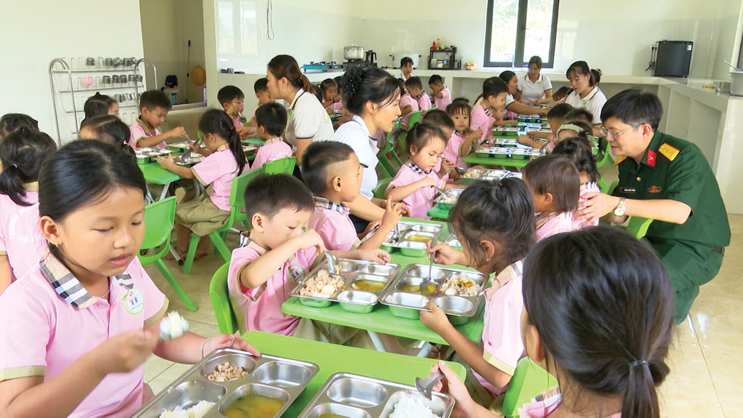 Nhà trường chú trọng kiểm tra, giám sát, quản lý các hoạt động bán trú, bảo đảm an toàn cho trẻ và vệ sinh môi trường. Bếp ăn được thay đổi thực đơn theo tuần, theo mùa, tính khẩu phần phù hợp độ tuổi và đảm bảo an toàn thực phẩm. Trẻ được cân đo, theo dõi và khám sức khỏe định kỳ, nhờ đó phát triển bình thường về nhận thức, ngôn ngữ, cân nặng, chiều cao; tỷ lệ suy dinh dưỡng giảm đều hàng năm.