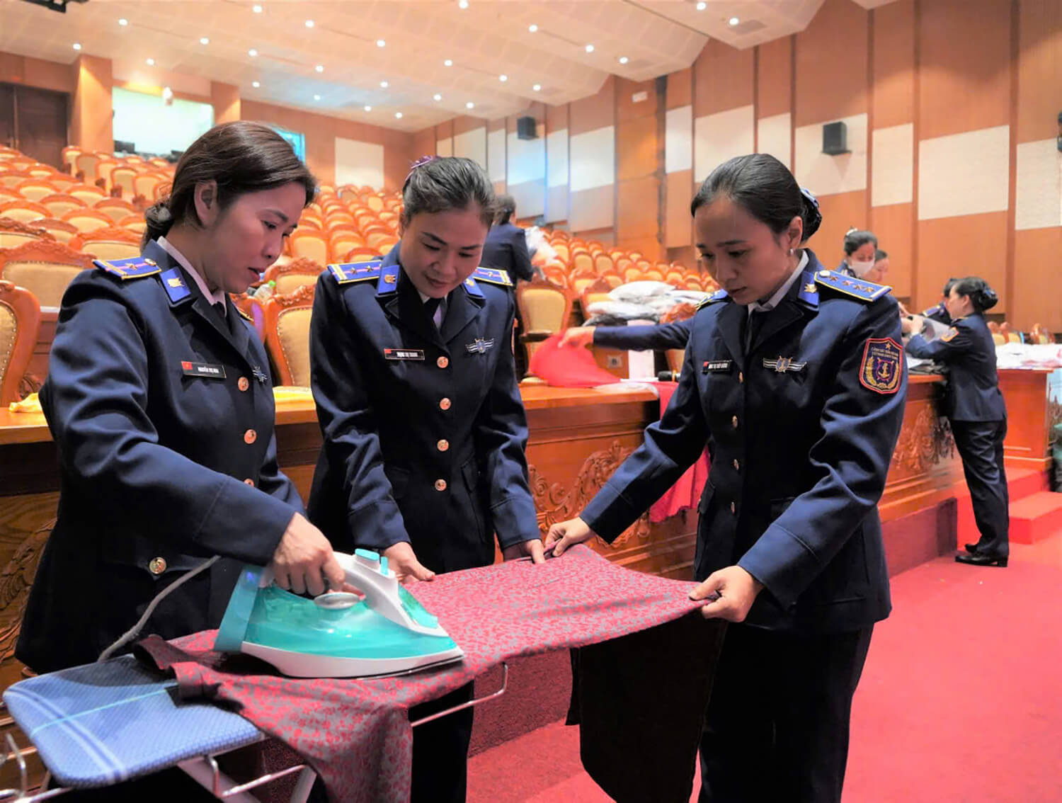 Cán bộ, hội viên phụ nữ cơ quan Bộ Tư lệnh Cảnh sát biển chuẩn bị áo dài gửi tặng bà con.