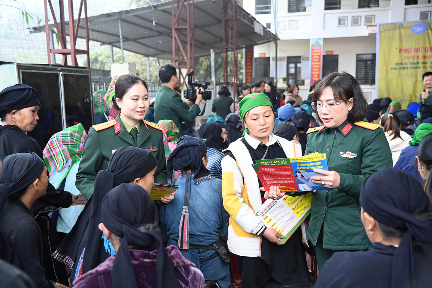 Cùng các hoạt động chính sách, tại chương trình, Ban Tổ chức còn phối hợp với Cục Pháp chế (Bộ Quốc phòng) tổ chức tuyên truyền, phổ biến pháp luật cho bà con. Đại tá Lê Trọng Xuân, Phó Trưởng phòng Kế hoạch Tổng hợp, Cục Pháp chế/Bộ Quốc phòng, đã giới thiệu hai chuyên đề mang tính cấp thiết: “Phòng, chống mua bán phụ nữ và trẻ em tại các xã biên giới”, “Giải pháp giảm thiểu tình trạng tảo hôn và hôn nhân cận huyết thống trong đồng bào dân tộc thiểu số”, trực tiếp chia sẻ những kiến thức thiết thực về Luật Hôn nhân & gia đình, phòng chống bạo lực gia đình và sinh đẻ có kế hoạch,... Hoạt động này góp phần nâng cao nhận thức, giúp bà con vùng biên vững vàng hơn trước các hủ tục và tội phạm, xây dựng đời sống văn hóa mới.