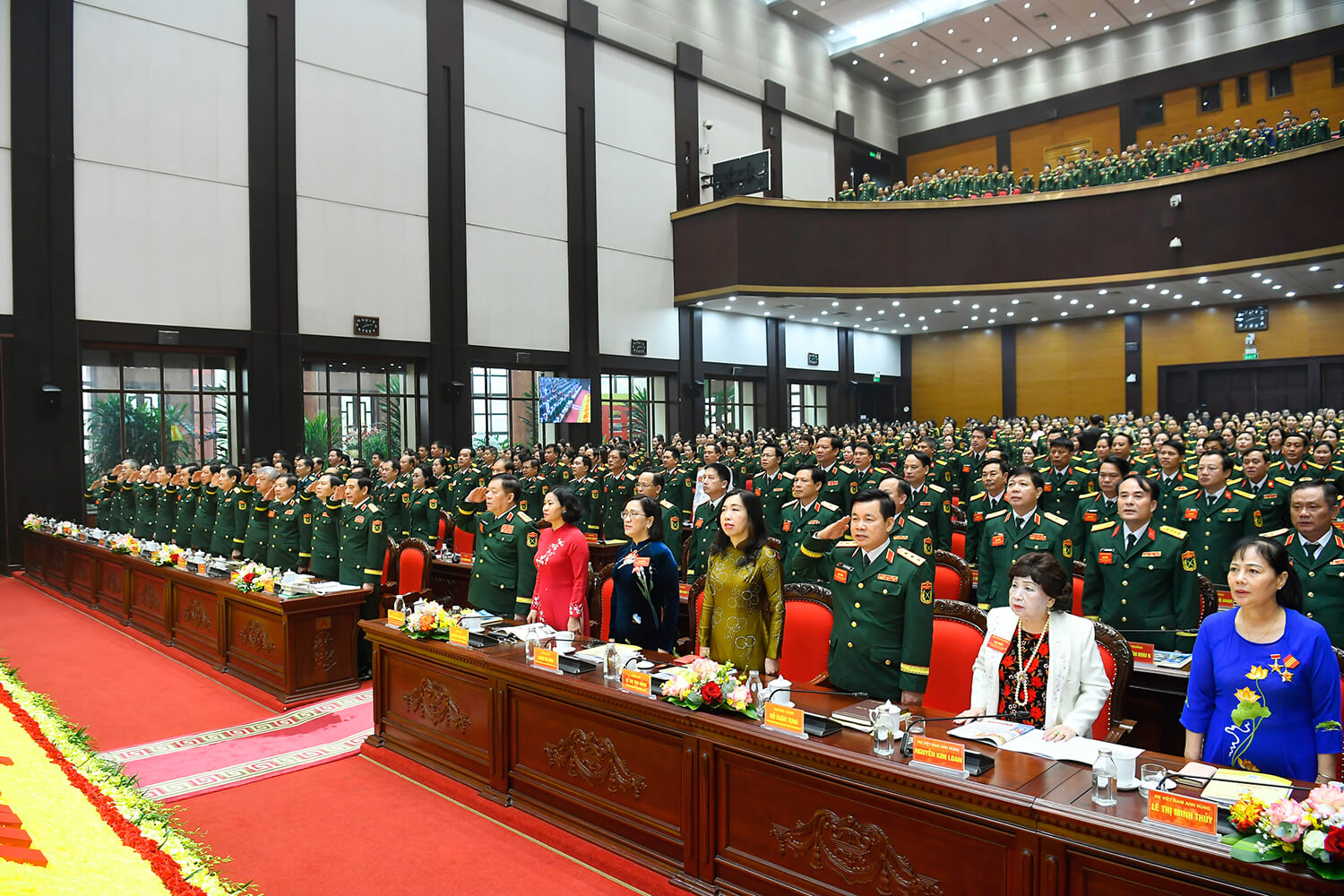 Đại tướng Nguyễn Trọng Nghĩa - Chủ nhiệm Tổng cục Chính trị và bà Nguyễn Thị Tuyến - Chủ tịch Hội LHPN Việt Nam tặng hoa chúc mừng đoàn đại biểu dự Đại hội phụ nữ toàn quốc lần thứ XIV
