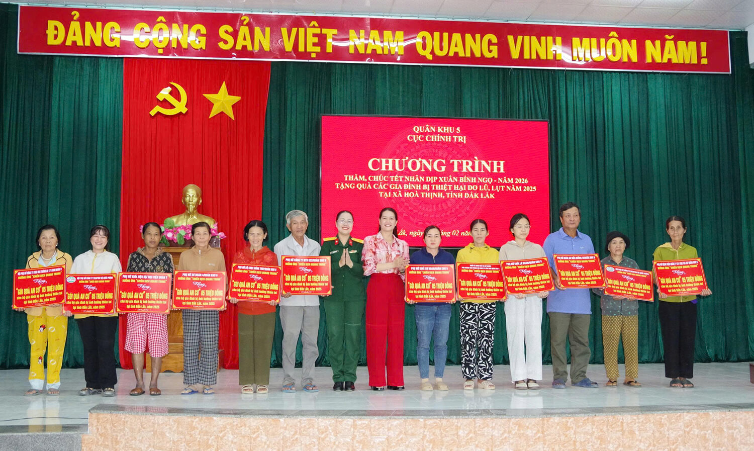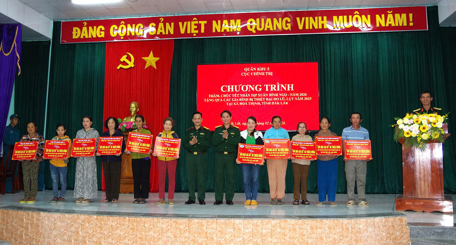 Những ngày giáp Tết Nguyên đán, đoàn công tác Cục Chính trị Quân khu 5 do Đại tá Nguyễn Đăng Thạch, Trưởng phòng Công tác Quần chúng, làm trưởng đoàn đã đến thăm, chúc Tết và trao quà an cư cho các hộ dân bị thiệt hại nặng nề trong trận lũ lịch sử xảy ra tháng 11-2025 tại xã Hòa Thịnh, tỉnh Đắk Lắk. Hoạt động nằm trong khuôn khổ Chương trình “Phụ nữ Quân khu lan tỏa yêu thương”, do Phụ nữ Quân khu 5 tổ chức, nhằm cụ thể hóa chủ trương của Ban Phụ nữ Quân đội trong tham gia thực hiện “Chiến dịch Quang Trung” do Thủ tướng Chính phủ phát động.