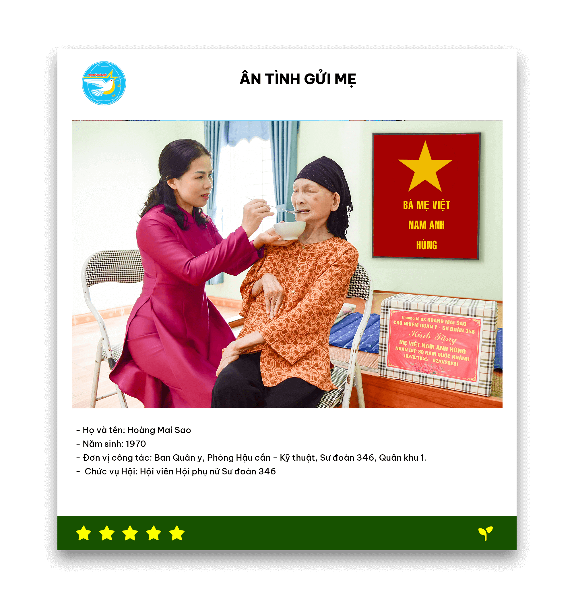 Người phụ nữ chăm sóc mẹ không chỉ đại diện cho tình cảm riêng tư, mà còn là hình ảnh tiêu biểu của người phụ nữ Việt Nam thời đại mới: biết gìn giữ truyền thống, nặng nghĩa tình, giàu lòng nhân ái và trọn vẹn chữ hiếu. Từng cử chỉ khẽ khàng, từng ánh mắt đầy sự sẻ chia của chị đã cho thấy sự gắn bó giữa các thế hệ - từ quá khứ anh hùng đến hiện tại nghĩa tình.
