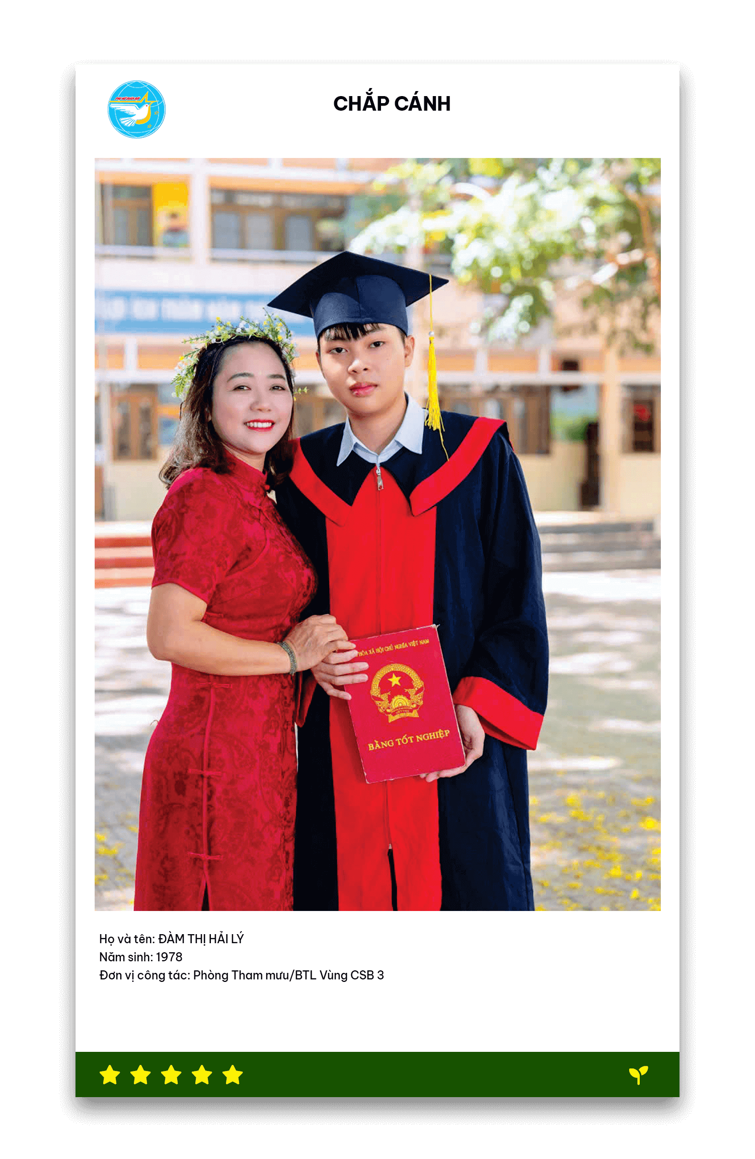Bên bờ sông Dinh hiền hòa, giữa âm thanh lật giấy và con dấu, tôi lặng thầm, tận tụy với công tác văn thư tại Bộ Tư lệnh Vùng Cảnh sát biển 3. Mỗi văn bản đến và đi không chỉ là giấy tờ, mà là mệnh lệnh, kế hoạch, là sự sống còn của những chuyến hải trình. Dù áp lực, tôi vẫn giữ nụ cười hiền hậu, hoàn thành nhiệm vụ “người gác cổng” thông tin của đơn vị. Sau giờ làm, tôi tìm về “bến đỗ” bình yên bên chồng và hai con. Niềm tự hào lớn nhất là hai con trai ngoan ngoãn, học giỏi. Con trai lớn, sau nhiều năm học tại Học viện Hải quân, giờ là sĩ quan trẻ trên những con tàu ra khơi, còn con thứ hai vừa thi đỗ lớp 10 với số điểm 26,5. Khoảnh khắc chụp ảnh cùng các con, tôi trong tà áo dài đỏ thắm, nụ cười rạng rỡ, là minh chứng cho nỗ lực của cả gia đình.