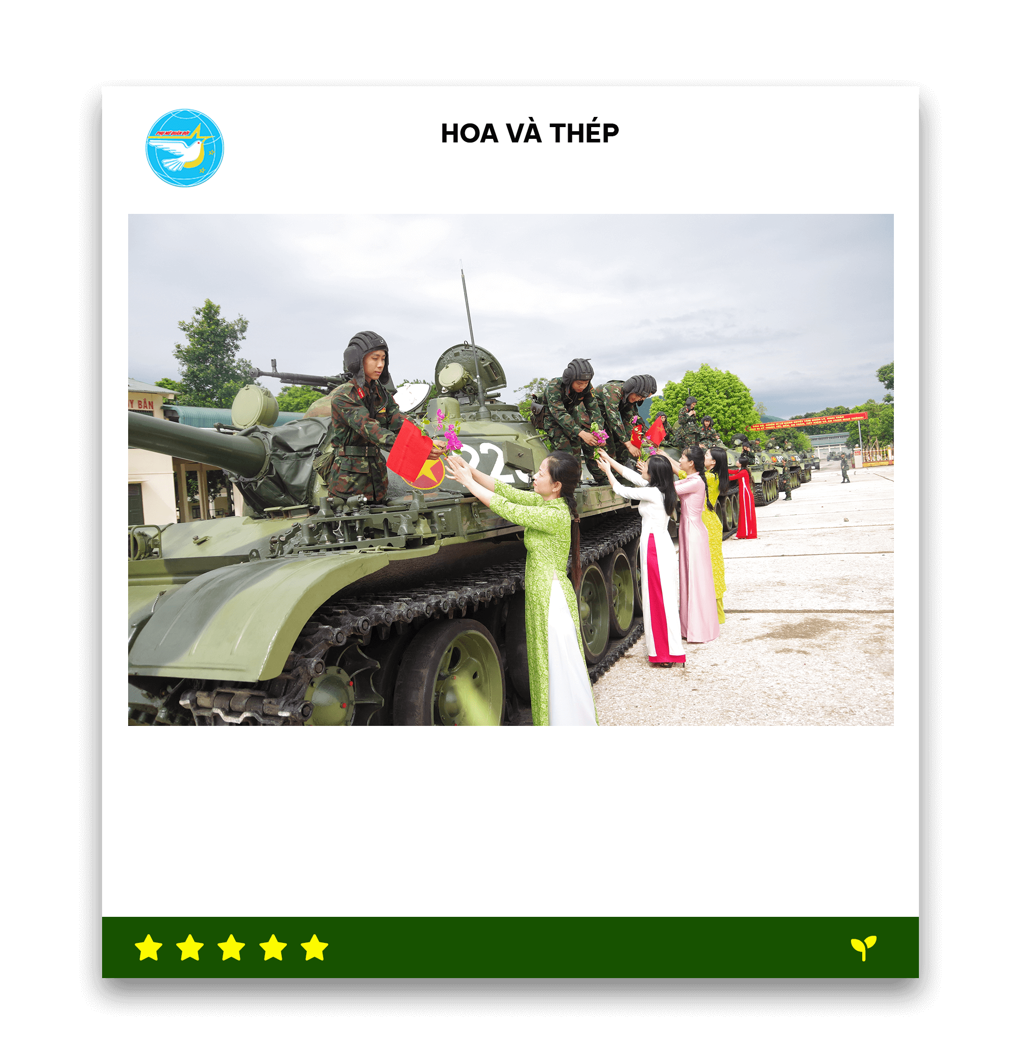 Trên nền những chiếc xe tăng hùng dũng, hình ảnh phụ nữ Lữ đoàn Xe tăng 201 duyên dáng trong tà áo dài truyền thống Việt Nam trao những bó hoa tươi thắm cho người lính Tăng thiết giáp tạo nên một khoảnh khắc vừa thiêng liêng, vừa mềm mại.
