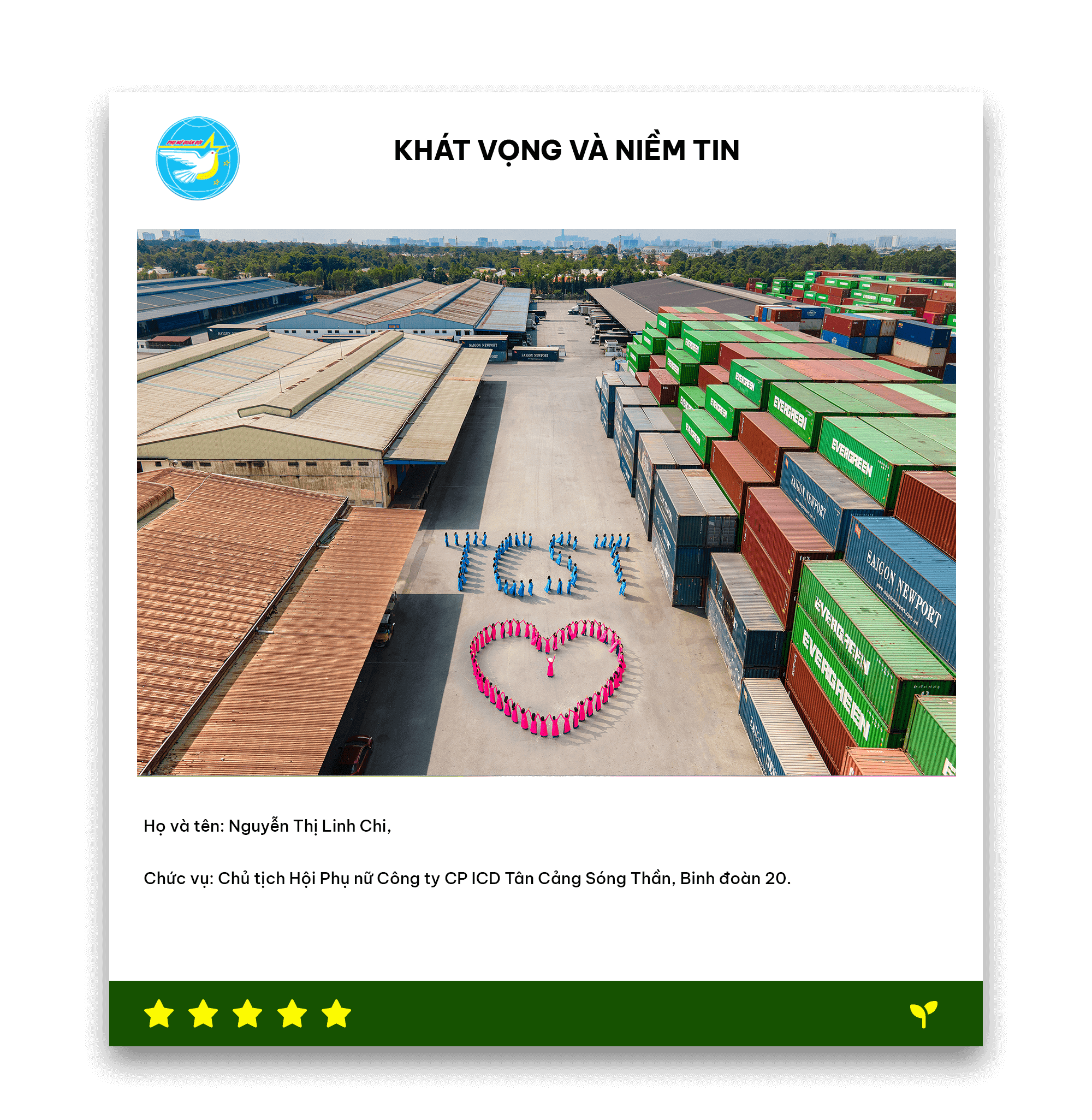 Trước mái nhà chung, phụ nữ ICD Tân Cảng Sóng Thần, Binh đoàn 20, trong tà áo dài xanh đã cùng kết thành hình trái tim - biểu tượng của sự gắn bó, yêu thương và niềm tự hào. Hình ảnh ấy không chỉ tôn vinh vẻ đẹp truyền thống của người phụ nữ Việt Nam, mà còn gửi gắm thông điệp sâu sắc trong hành trình 25 năm xây dựng và phát triển công ty.