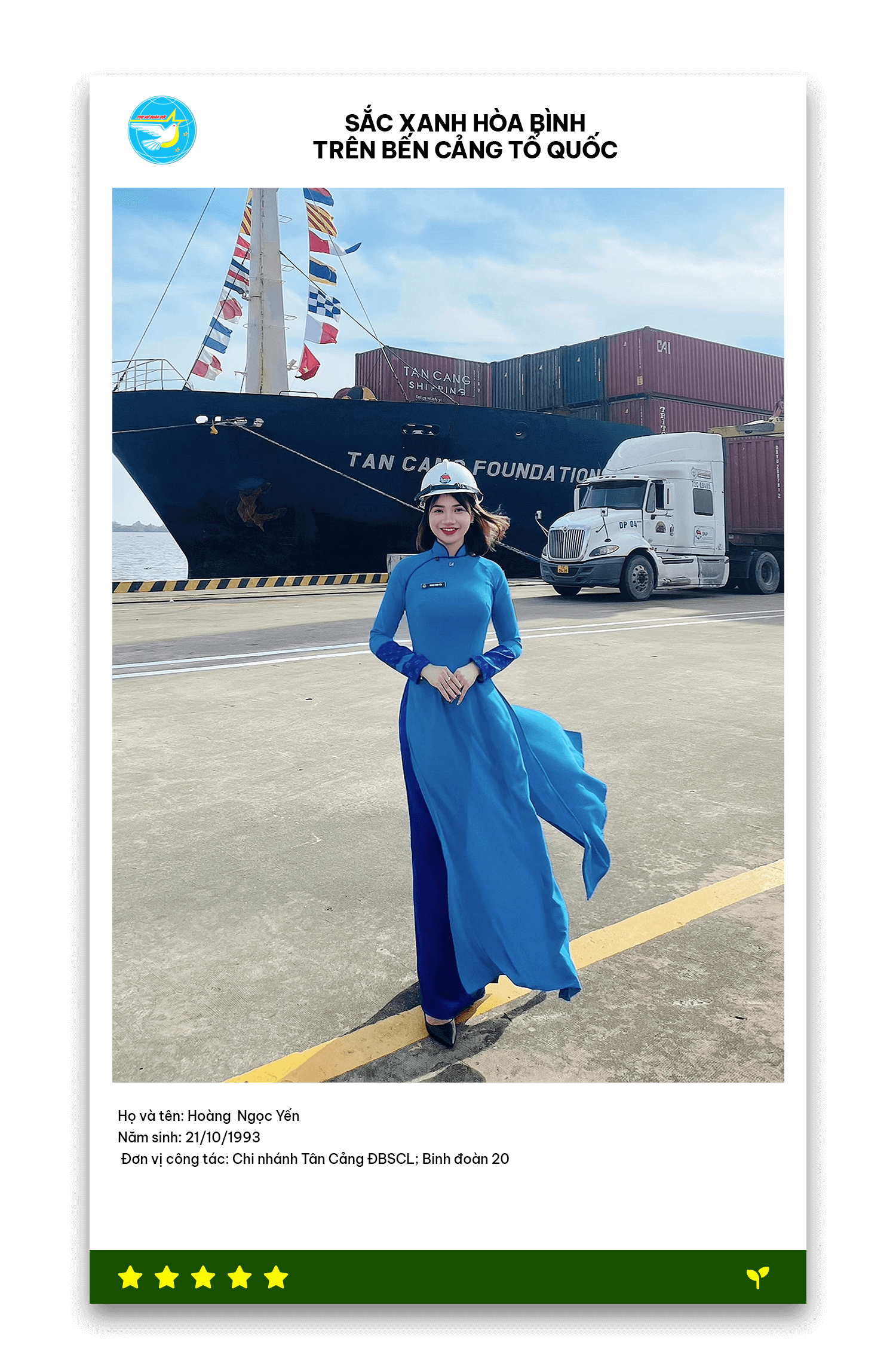 Đứng trước con tàu sừng sững phía sau lưng, tôi thấy rõ hơn trách nhiệm của mình: vừa gìn giữ vẻ đẹp truyền thống của người phụ nữ Việt trong tà áo dài, vừa dốc sức đóng góp cho sự lớn mạnh của đơn vị, của ngành cảng biển. Bức ảnh được đồng nghiệp tôi - nhân viên Chi nhánh Tân Cảng Đồng bằng sông Cửu Long, Binh đoàn 20 - ghi lại như một lát cắt nhỏ, nhưng đủ để gửi gắm niềm tự hào của tôi và tập thể, khi sắc xanh hòa bình trên tà áo dài quyện cùng màu xanh đại dương, hướng tới một tương lai phát triển, hội nhập và thịnh vượng.