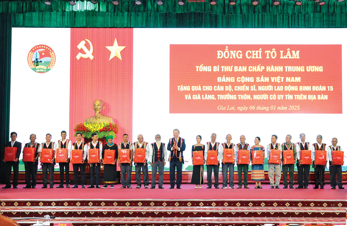 Rơ Mah H’Liên (thứ 10 từ phải sang) nhận quà của Tổng Bí thư Tô Lâm (tháng 1-2025)