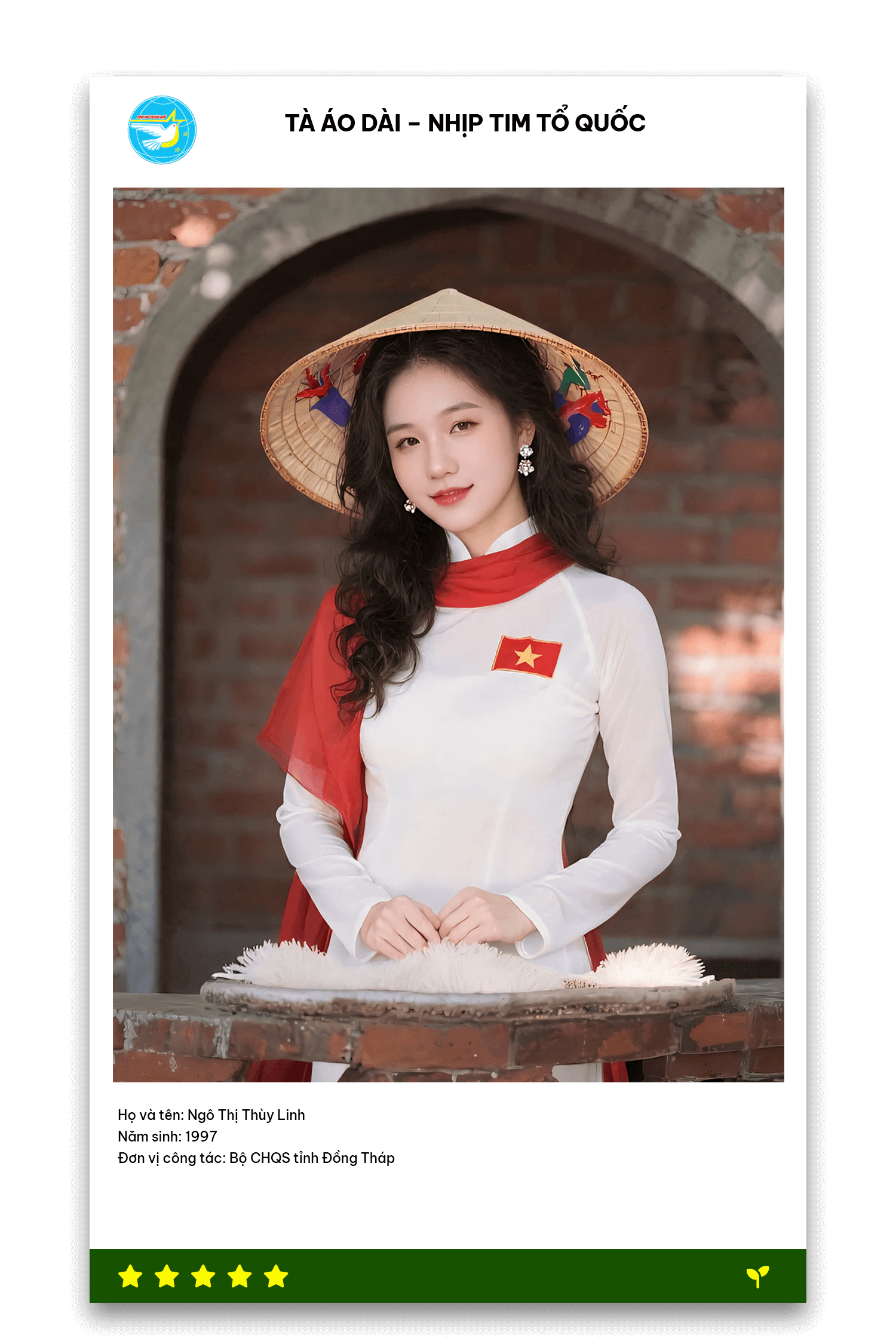 Giữa khung gạch xưa trầm mặc, tà áo dài trắng tinh khôi khẽ bay trong gió, nổi bật lá cờ đỏ sao vàng nơi ngực trái như nhịp tim tự hào hòa cùng hơi thở Tổ quốc. Chiếc nón lá mộc mạc đặt trên dáng người thanh thoát gợi nhớ mùa lúa chín, dòng sông quê bình yên – tất cả khắc họa nét duyên Việt giản dị mà kiêu hãnh.