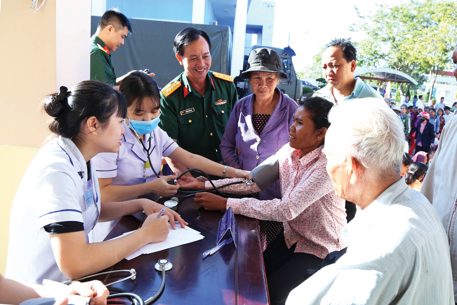 Các nữ y, bác sĩ Bệnh viện Quân y 4 (Cục Hậu cần Quân đoàn 34) khám bệnh, cấp thuốc miễn phí cho người dân nghèo vùng sâu, vùng xa xã Tân Thành, tỉnh Tây Ninh