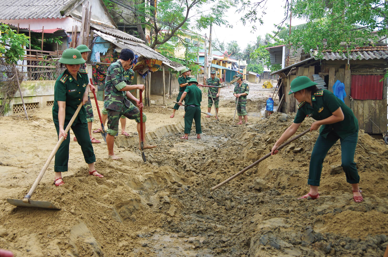Hội viên phụ nữ và cán bộ, chiến sĩ BĐBP tỉnh Quảng Trị chung tay giúp nhân dân khắc phục hậu quả sau lũ lụt, thể hiện tinh thần “vì nhân dân phục vụ”