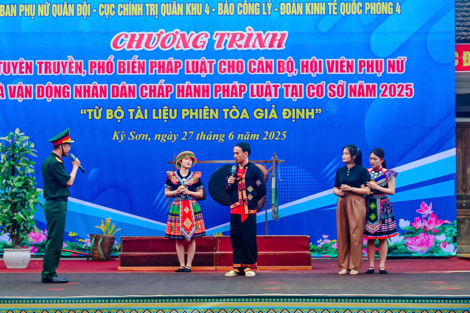 Tham dự có Thượng tá Nguyễn Thị Thanh - Phó Trưởng ban PNQĐ; Đại tá Nguyễn Kỳ Hồng - Phó Chủ nhiệm Chính trị Quân khu 4; Đại tá Lê Nam Thành - Trưởng phòng Pháp luật hành chính, Cục Pháp chế, Bộ Quốc phòng (BQP); đại diện các cơ quan Vụ Pháp chế BQP; Cục Chính trị, Tòa án Quân sự, Viện Kiểm sát Quân sự, Đoàn Kinh tế - Quốc phòng 4 cùng hơn 500 cán bộ, phụ nữ và người dân trên địa bàn xã Na Ngoi. Chương trình được tổ chức trực tiếp tại xã, đồng thời trực tuyến toàn quốc, toàn quân, cấp Quân khu thông qua hệ thống phát sóng trực tuyến trên các Fanpage “Hoa Xương Rồng” của PNQĐ; “Phụ nữ Quân khu 4”, “Tuổi trẻ LLVT Quân khu 4”, “Nhánh Lan Rừng”, “Xưa và Nay”, Kênh truyền thông số như Youtube của Báo Công lý…