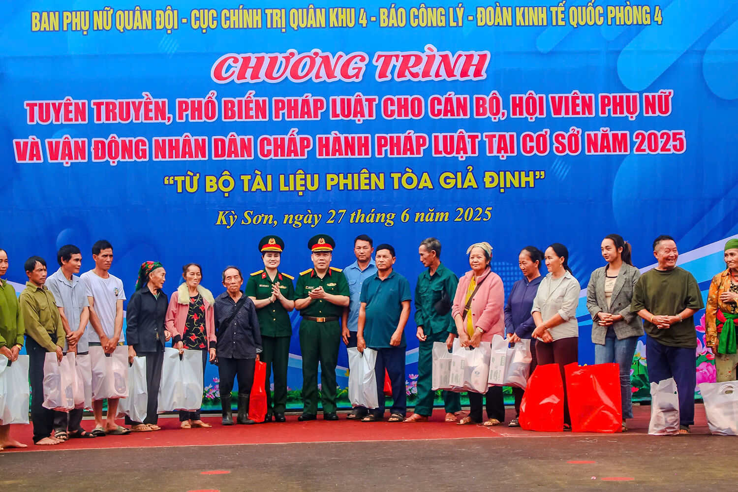 Sáng 27-6-2025, tại xã Na Ngoi, huyện Kỳ Sơn, tỉnh Nghệ An, Ban Phụ nữ Quân đội (PNQĐ) phối hợp với Cục Chính trị Quân khu 4, Báo Công lý - Tòa án Nhân dân tối cao, Đoàn Kinh tế Quốc phòng 4 tổ chức chương trình tuyên truyền, phổ biến pháp luật cho cán bộ, hội viên phụ nữ và vận động nhân dân chấp hành pháp luật tại cơ sở năm 2025 “Từ bộ tài liệu phiên tòa giả định”.