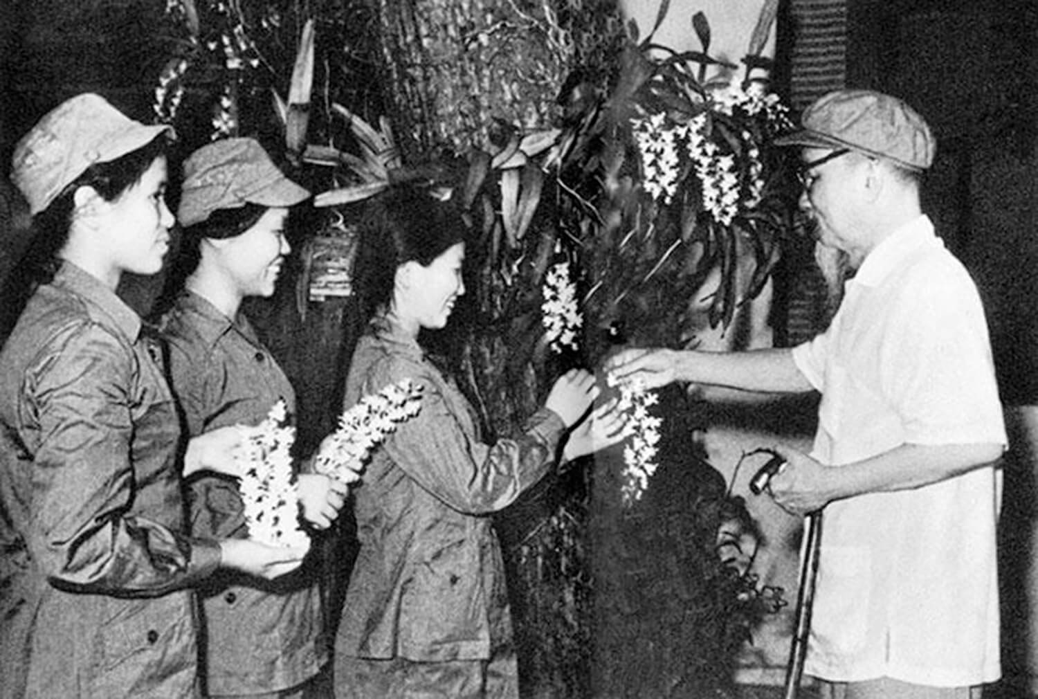 Chủ tịch Hồ Chí Minh tặng hoa phong lan cho ba nữ dân quân Quảng Bình và Vĩnh Linh, 1968