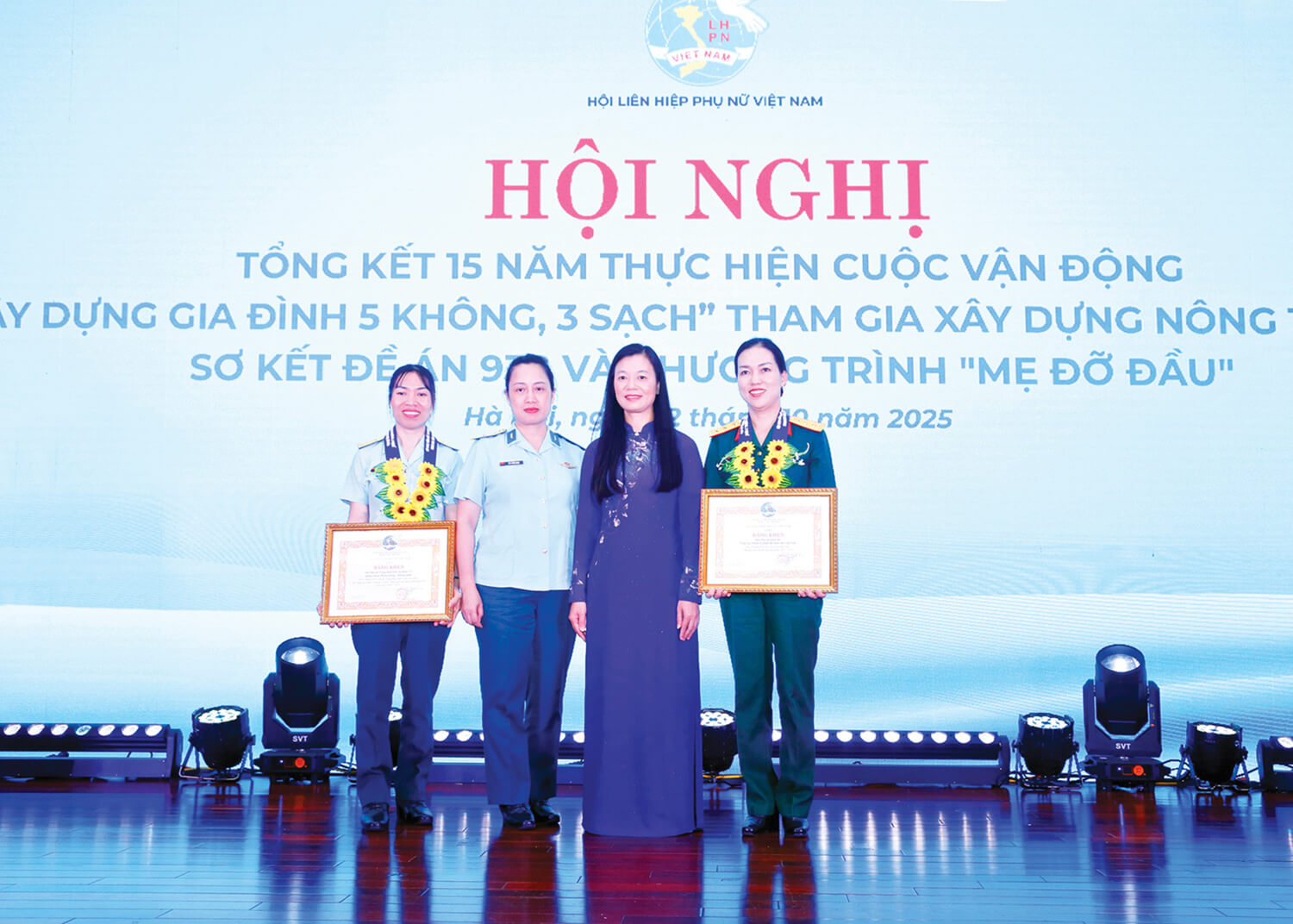 Tổng kết 15 năm cuộc vận động “Xây dựng gia đình 5 không, 3 sạch”, sơ kết giữa kỳ Đề án 938 và chương trình “Mẹ đỡ đầu”, Trung ương Hội đã tuyên dương 84 tập thể, cá nhân điển hình, trong đó có Ban Phụ nữ Quân đội (PNQĐ) và Hội Phụ nữ Trung đoàn 916, Sư đoàn 371, Quân chủng Phòng không - Không quân. Thêm minh chứng sống động cho sự sáng tạo, tinh thần trách nhiệm và tính nhân văn sâu sắc của PNQĐ trong phong trào thi đua cả nước.